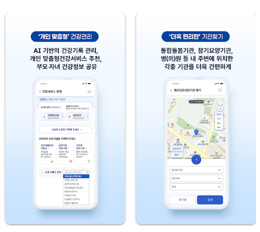 또한 ‘건강관리’ 메뉴에서는 개인 건강 정보 확인과 맞춤형 건강관리 서비스를 이용할 수 있습니다.