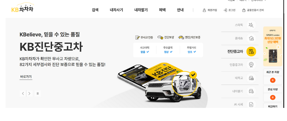 KB캐피탈이 운영하는 중고차 거래 서비스로 인증 매물 중심의 시스템이 특징입니다. 경매 기능도 지원하며 개인 판매자가 직접 차량을 등록해 거래할 수 있는 구조를 갖추고 있습니다.