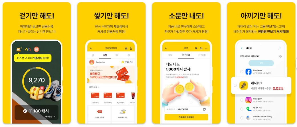 - 제휴 상점: 적립 캐시로 카페, 편의점 등 전국 수만 개 매장의 기프티콘을 구매합니다.