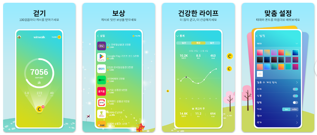 매일 걷기만 해도 머니가 쌓이며 퀴즈나 출석 체크 등 가벼운 활동으로 보상을 키울 수 있습니다. 적립 보상을 실물 상품뿐 아니라 코인으로 바꿀 수 있다는 점이 다른 앱들과의 차별점입니다.