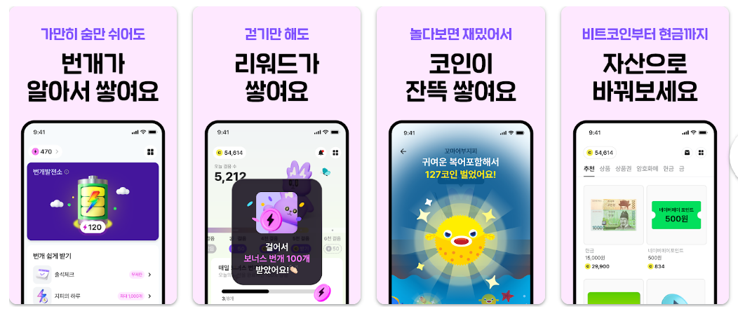 - 캐시 적립: 하루 최대 1만 보 달성 시 100캐시를 지급하는 만보기 기능을 제공합니다.