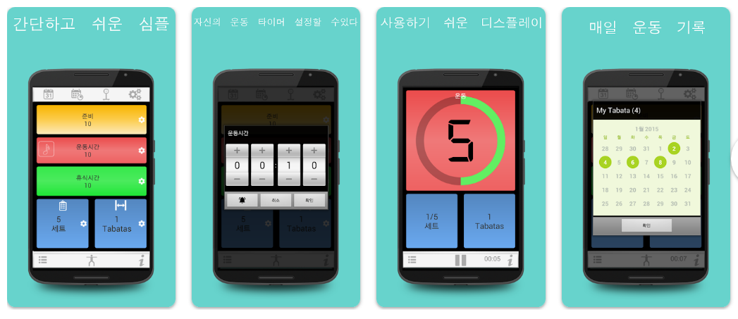 - 간편한 시간 설정: 준비 시간과 운동 시간 그리고 휴식 시간을 각각 사용자가 원하는 초 단위로 구성할 수 있습니다.