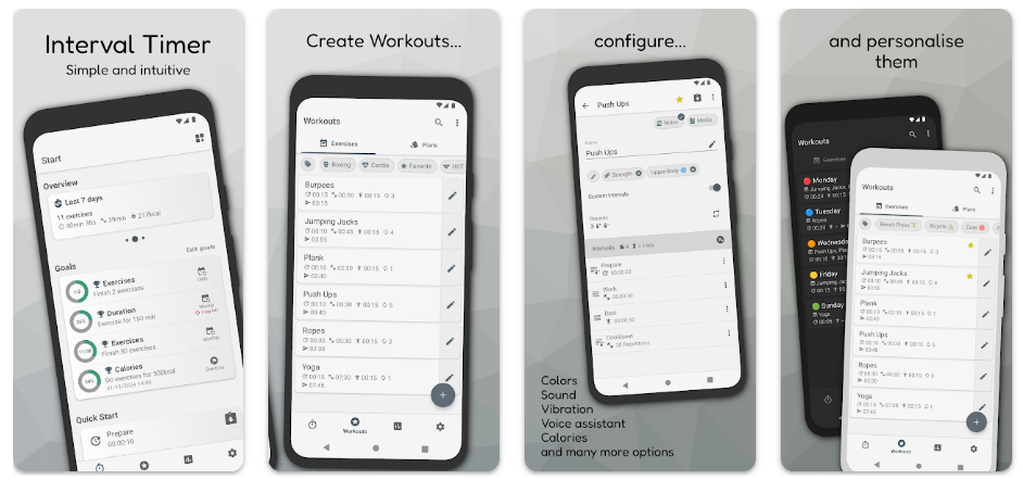 사용자 인터페이스가 매우 깔끔하며 타이머 작동 중에 방해 요소가 없도록 군더더기를 제거한 디자인이 특징입니다. 각 운동 단계에 고유한 이름을 지정할 수 있어 다음에 어떤 동작을 해야 하는지 텍스트로 미리 확인할 수 있습니다.