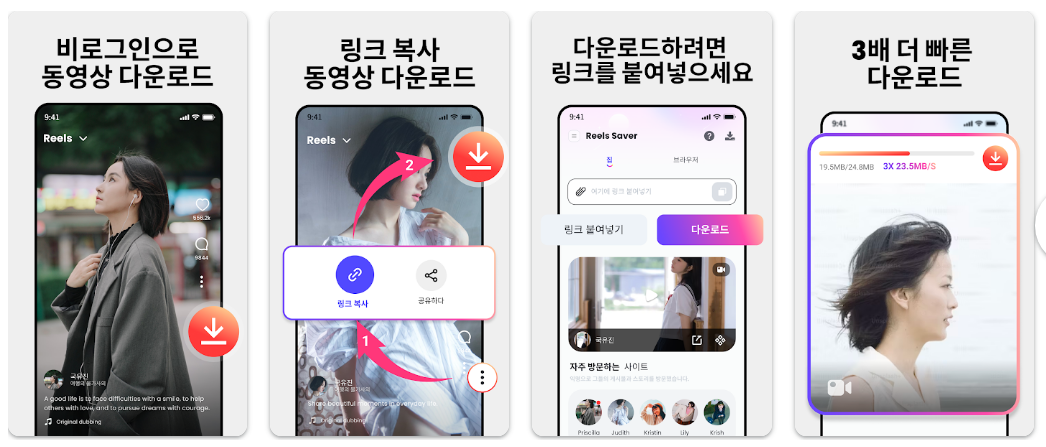 - "인스타그램 릴스 영상을 자주 보는데 마음에 드는 걸 바로 갤러리에 저장하니 정말 편하고 속도도 빠릅니다."