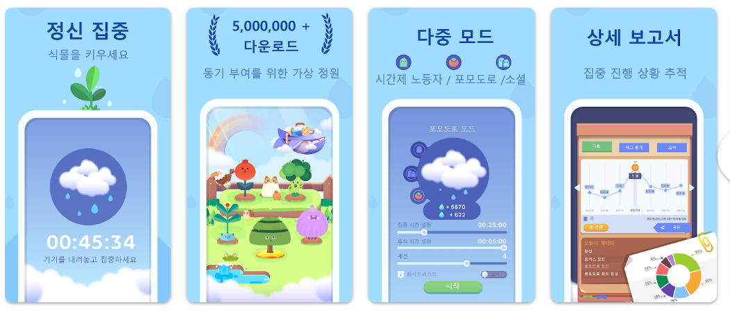 - 스마트폰 중독 방지. 타이머 작동 중 다른 앱을 사용하지 않도록 유도하여 온전한 집중 시간을 확보하게 돕습니다.