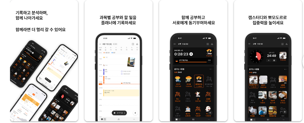 - 통계 및 타임테이블. 공부 시간을 시간표 형태로 시각화하여 어떤 시간대에 집중했는지 상세히 분석합니다.