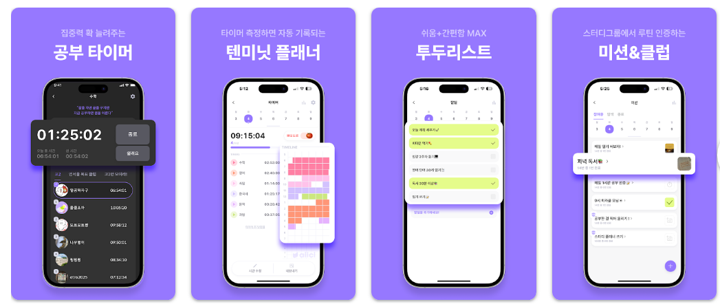 시간 기록에 그치지 않고 공부 자극 명언을 제공하거나 영단어 암기 및 일기 작성 기능을 포함하여 수험생의 정서적 관리까지 돕습니다. 또한 다른 사용자들과 함께하는 챌린지 시스템을 통해 서로를 응원하며 끝까지 목표를 완수할 수 있는 커뮤니티 공간을 제공합니다.